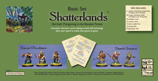 Shatterlands depicts conflicts between small patrols of Dumah Rangers and Rapani warriors in the Banakur Forest. Its scale is small and detailed, modeling the specific actions of individual men and women locked in desperate combat. Each game of Shatterlands is called an Encounter and can be played in around 90 to 120 minutes, resulting in a winner and loser. However, the consequences of these Encounters will reverberate beyond the end of the Encounter, as characters’ abilities change due to wounds they have sustained or experience they have gained.